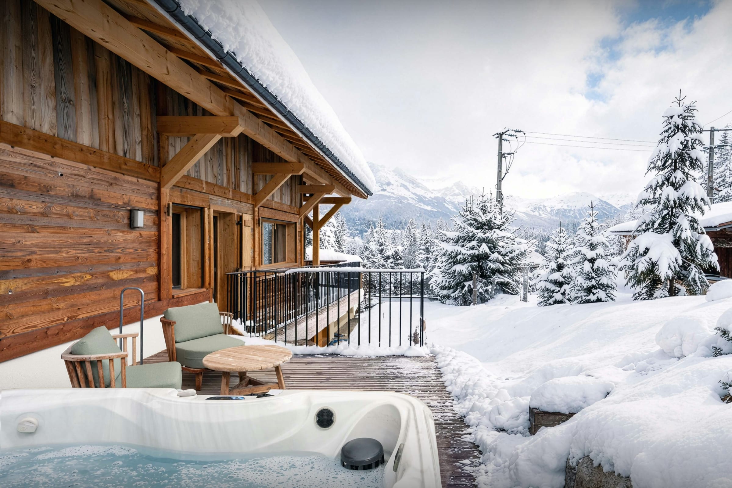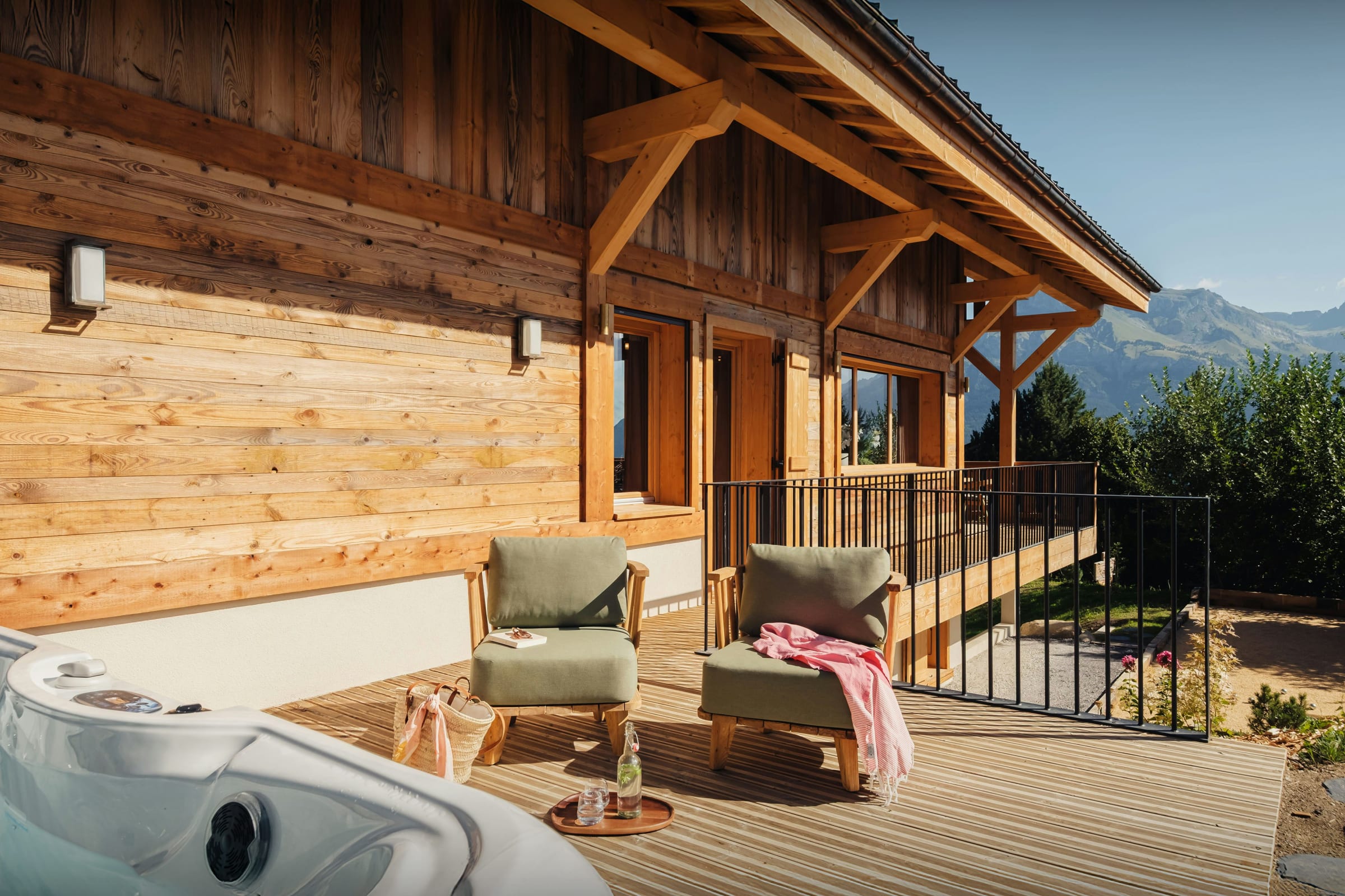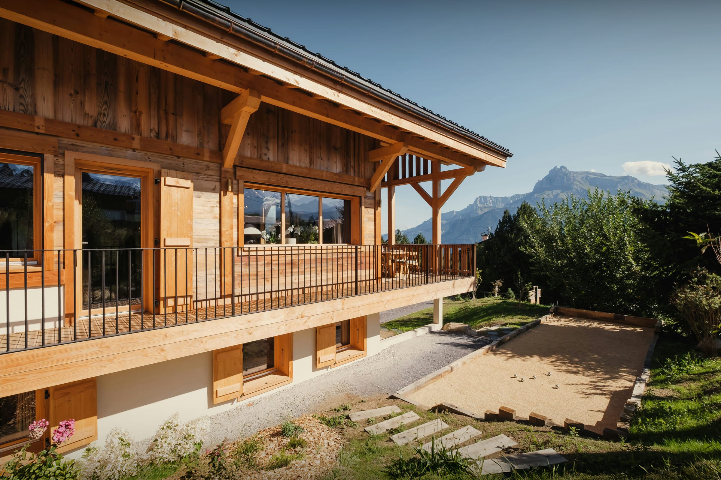 La propriété comprend également un sauna, un jacuzzi, une salle de cinéma, et une terrasse panoramique qui profite au mieux du paysage alpin. Cette dernière offre un espace extérieur très agréable, où vous pourrez y partager vos repas ou bien prendre l’apéritif. Trois des chambres bénéficient également d’un accès direct à un balcon. En été, vous pourrez profiter du jardin et de son terrain de pétanque.