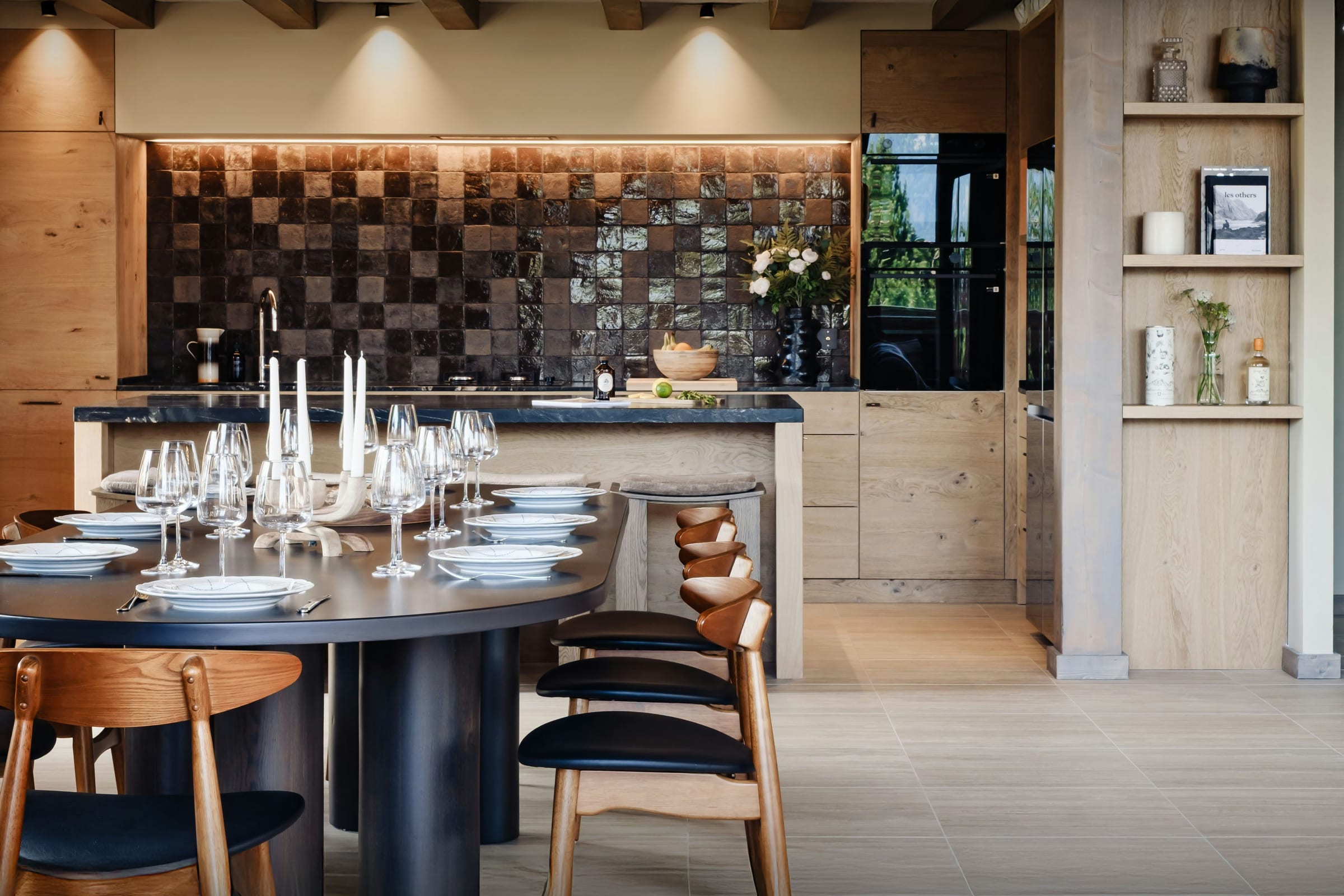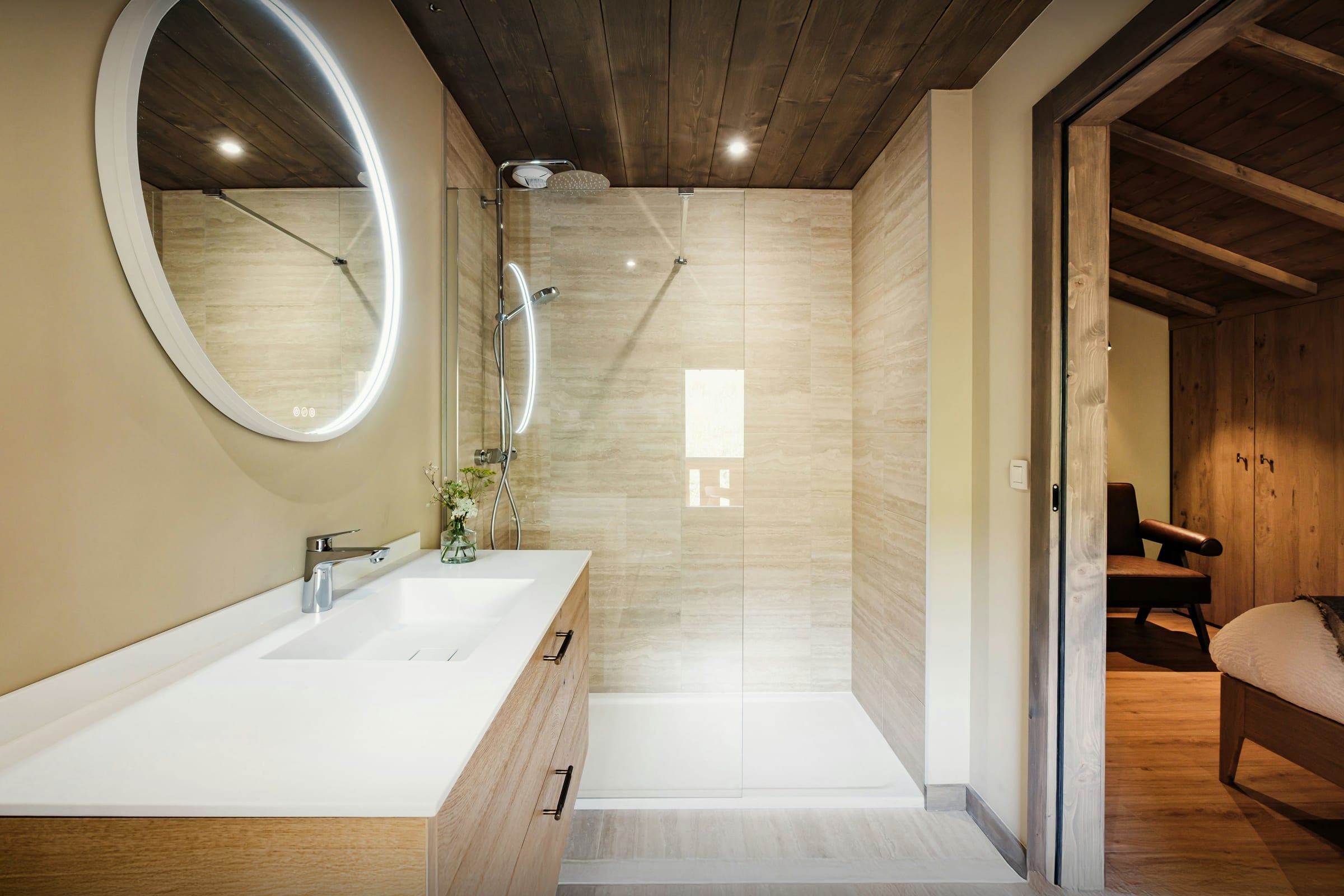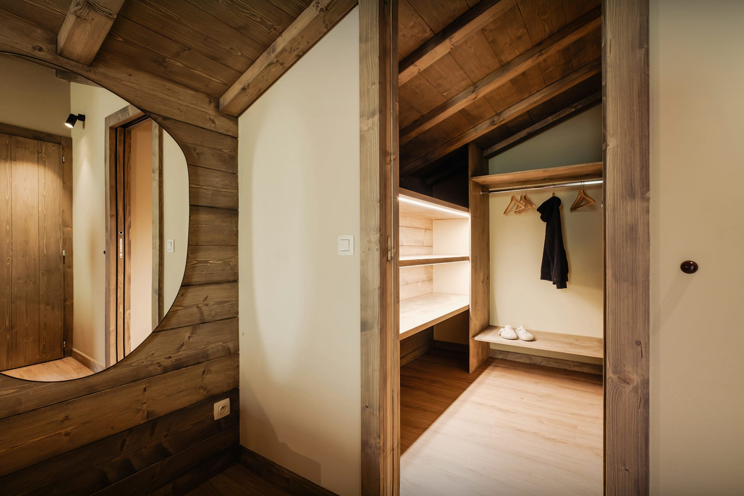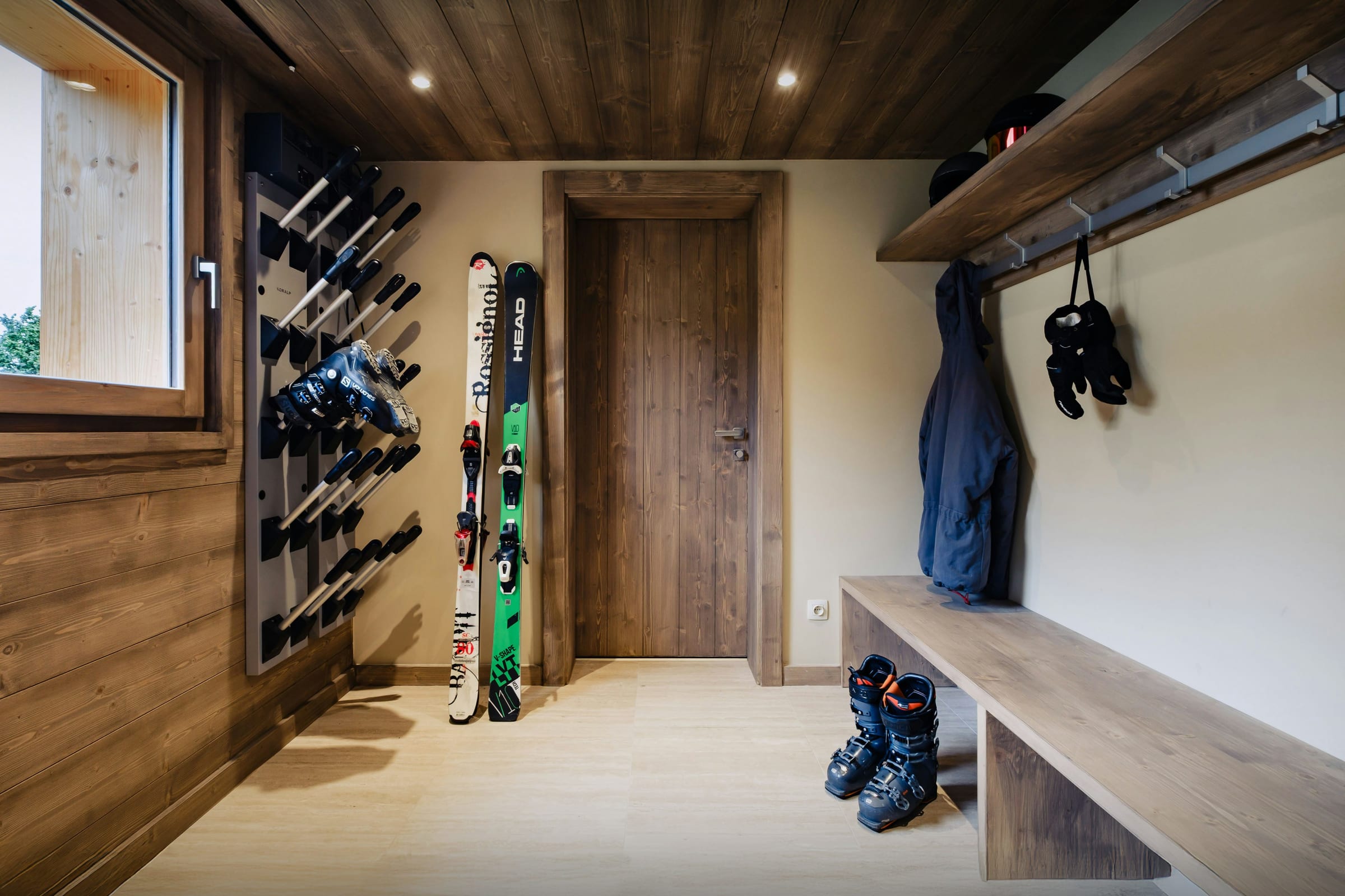 Le hall d’entrée connecté au local à skis permet de se mettre à l’aise dès son arrivée. Le garage peut abriter deux voitures, et il dispose d’une borne de recharge pour véhicules électriques.