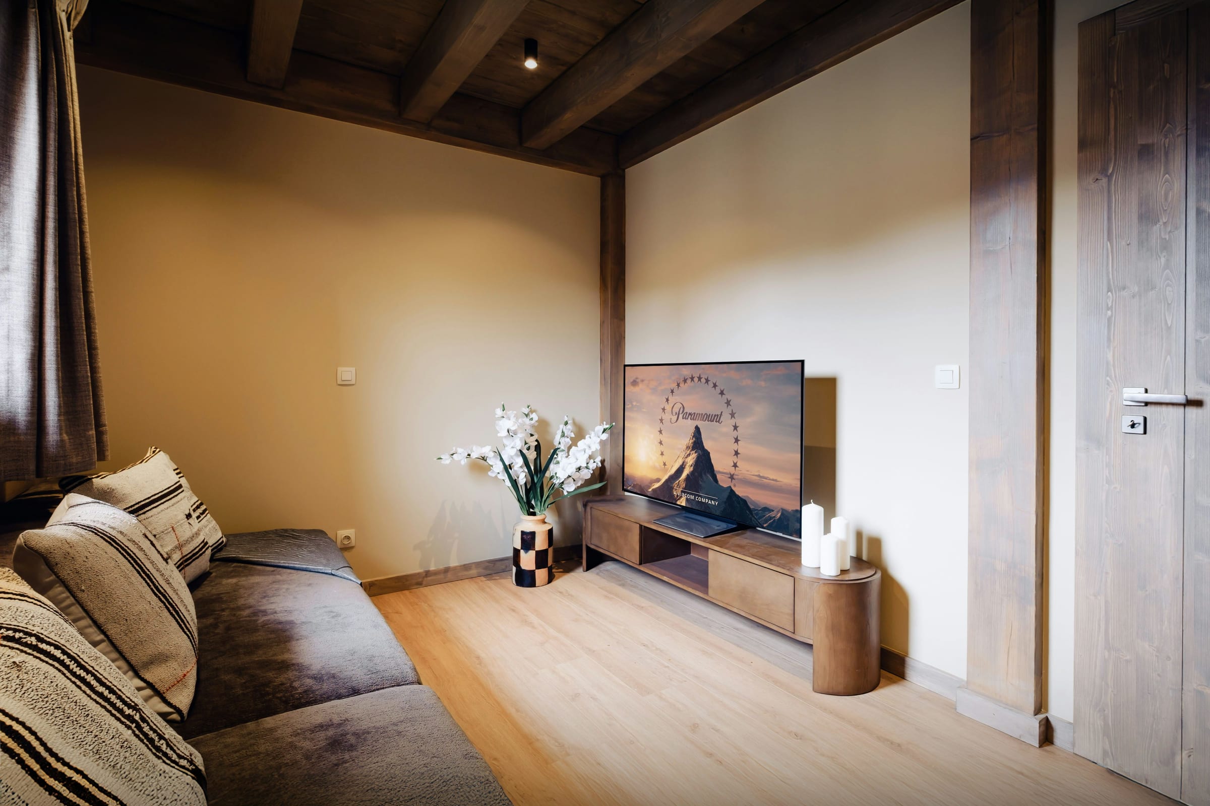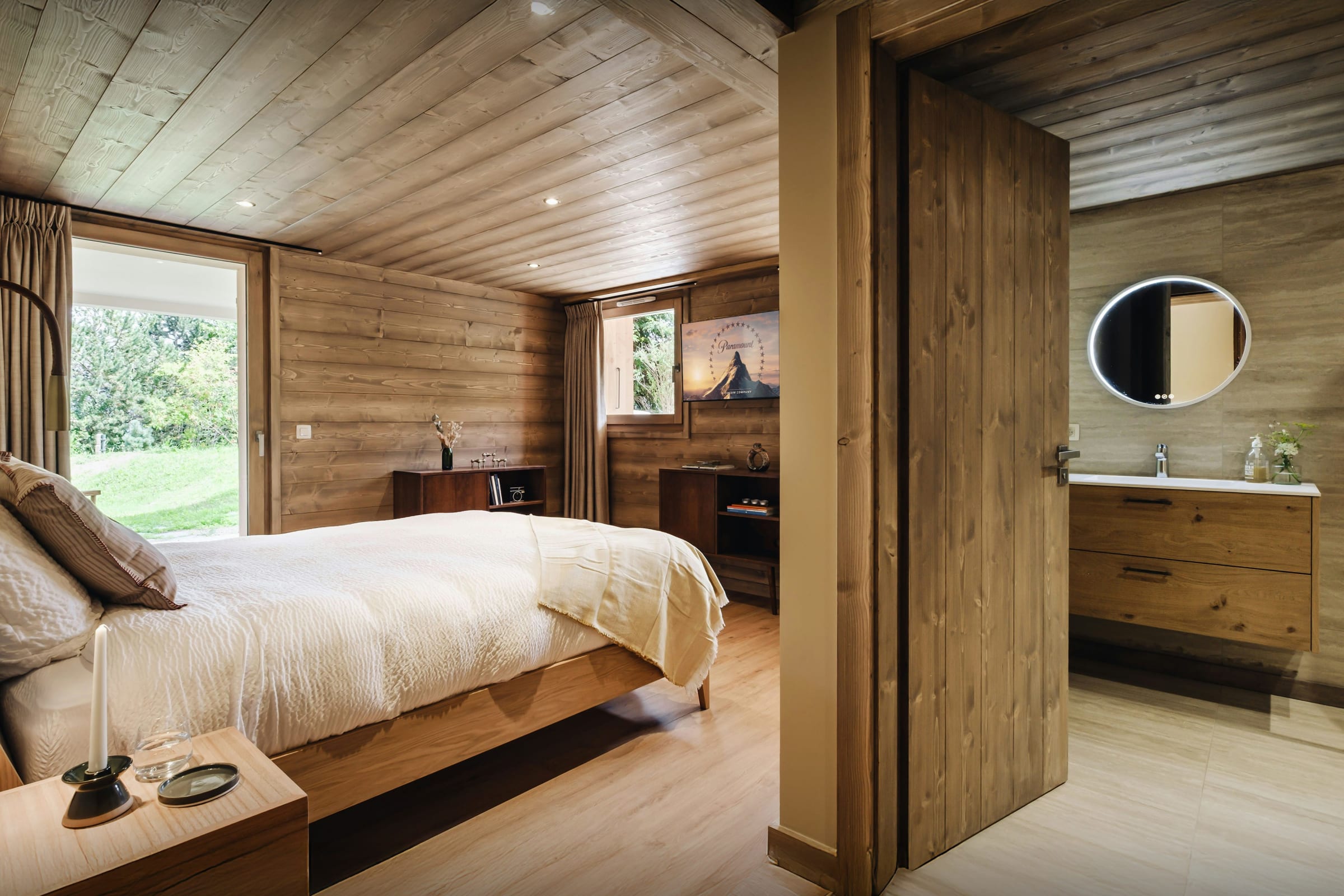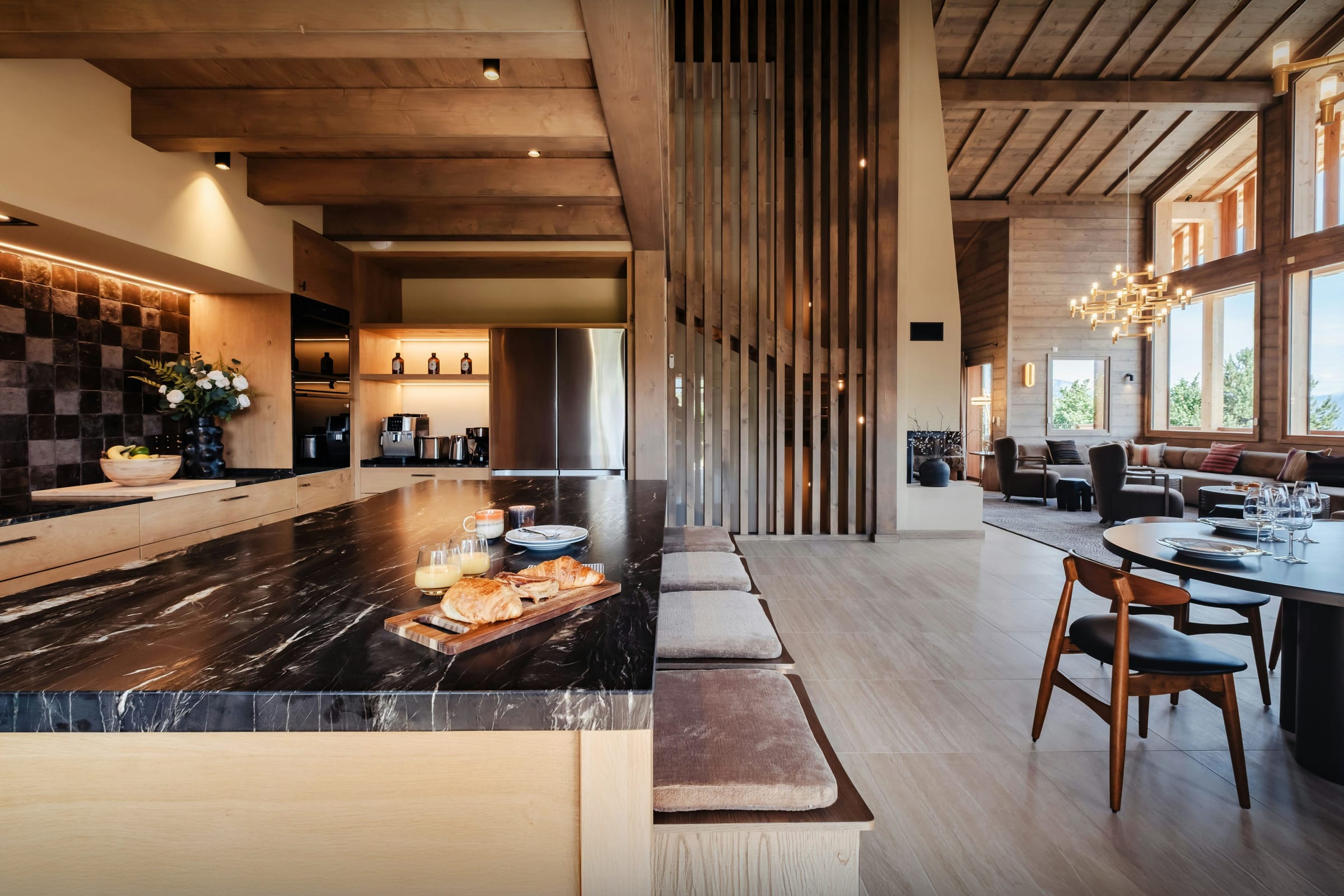 La décoration du chalet est soignée, les équipements sont haut de gamme, et de grandes baies vitrées baignent la pièce de vie de lumière naturelle. Celle-ci inclut une télévision et une cheminée, pour se réchauffer lors des longues soirées d’hiver.