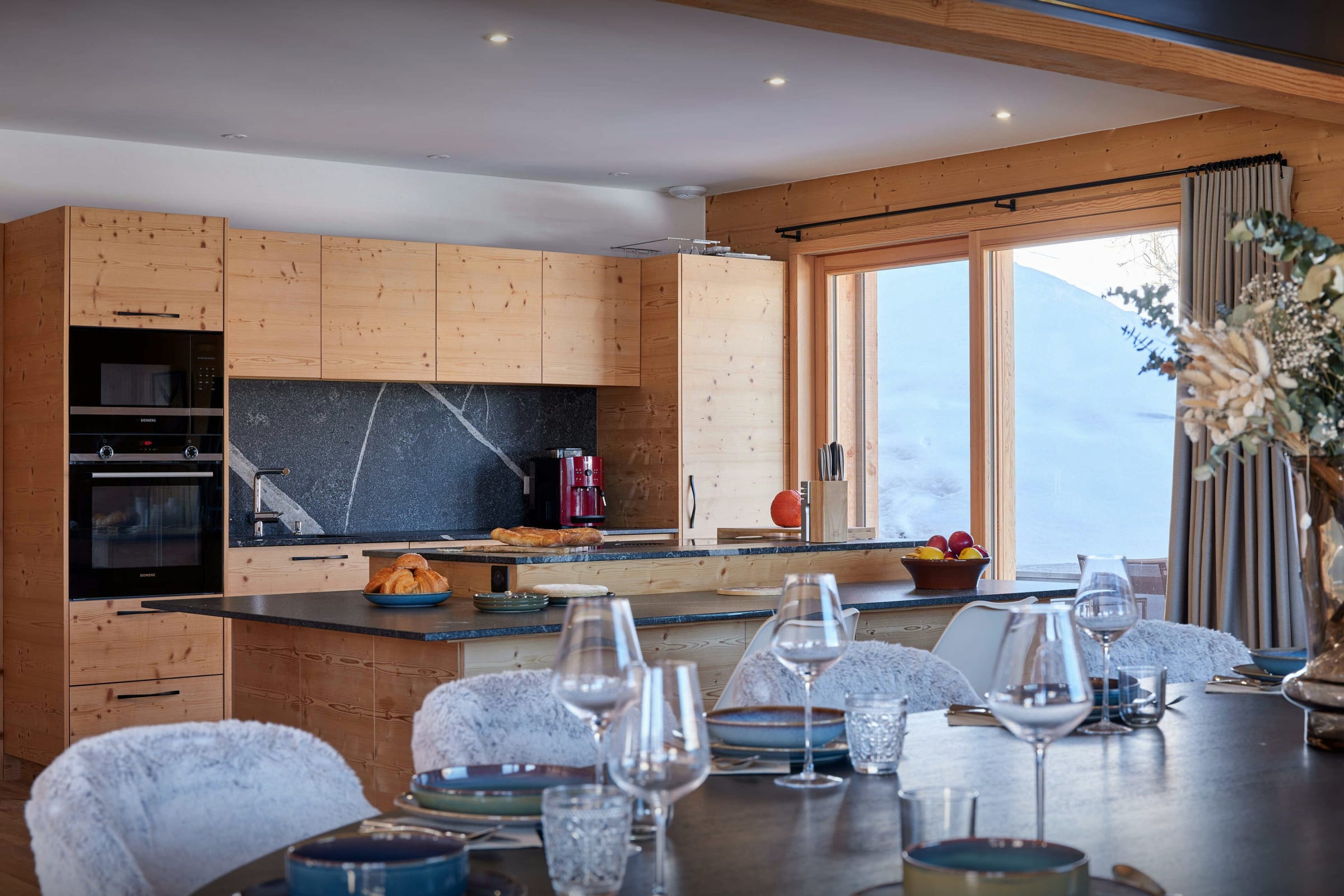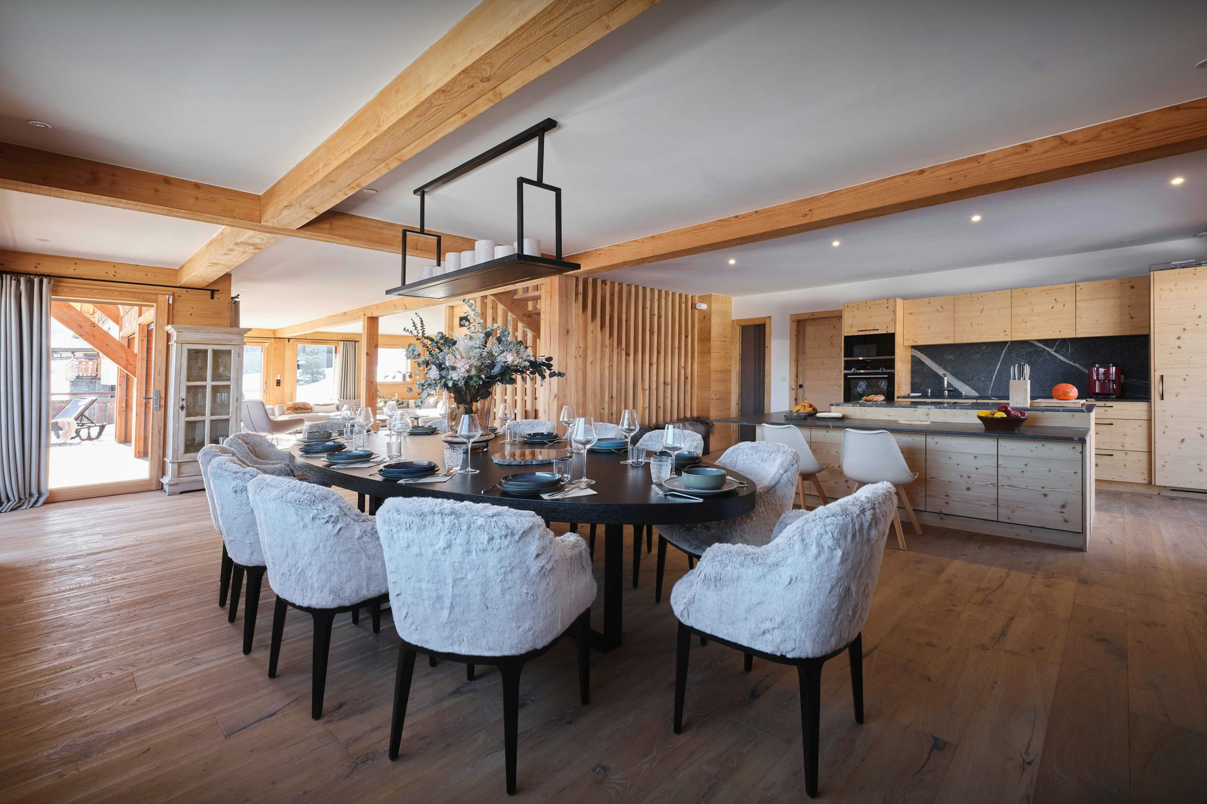 Sa grande pièce de vie ouverte constitue le cœur du chalet. Face aux montagnes, elle profite d’une belle luminosité et de balcons qui prolongent naturellement l’espace vers l’extérieur. Sa cheminée centrale réchauffera les soirées conviviales passées dans ses deux salons. La cuisine est tout équipée et la table à manger est assez grande pour accueillir toute la famille.