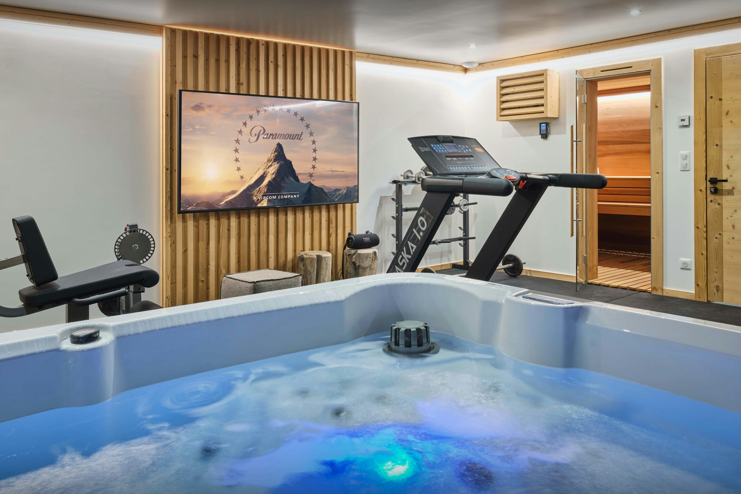 Après une journée au grand air, vous apprécierez particulièrement l’espace bien-être à l’étage inférieur. Son sauna et son jacuzzi garantissent une pause idéale pour relâcher les tensions, tandis que son home cinéma parfaitement équipé offre une atmosphère feutrée. Les équipements sportifs du chalet (poids, leg curl, tapis roulant, vélo d’appartement) permettent de se dépenser même en dehors des activités de plein air.